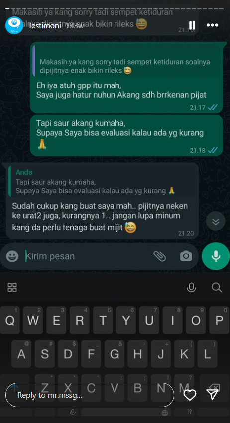 Selamat datang di MR.MASSAGE, tempat di mana kami memberikan perawatan pijat yang menyegarkan dan dapat memulihkan energi Anda. Kami berdedikasi penuh untuk memberikan layanan terbaik, Kami akan membantu mengatasi kelelahan dan cedera tubuh pada tubuh Anda.